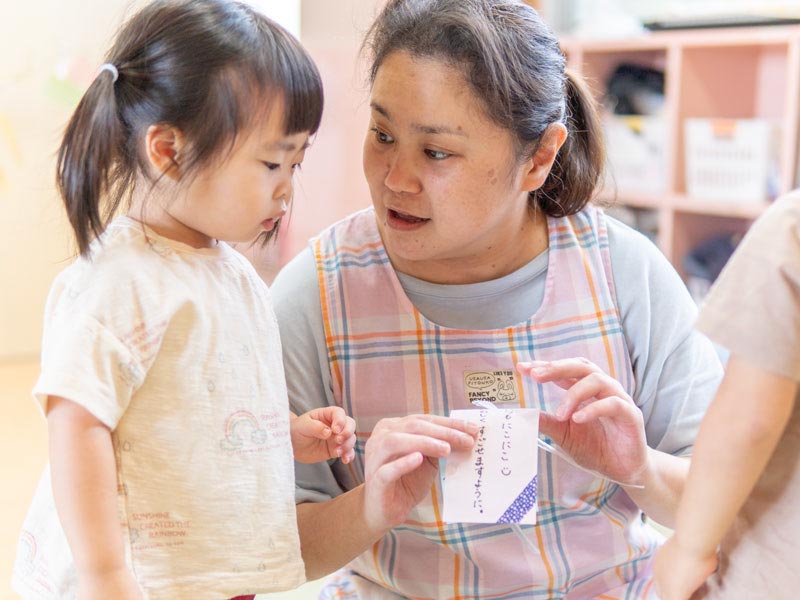 学生の時に行った実習とは違って、保育に加えてそれぞれの子どもの生活を保護者に伝える仕事があります。それぞれの子どもの様子を連絡ノートに書いたり、口頭で伝えたりしたときに保護者の方が嬉しそうにしてくれると私も一緒に嬉しくなります。
